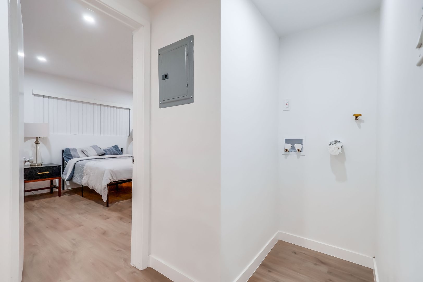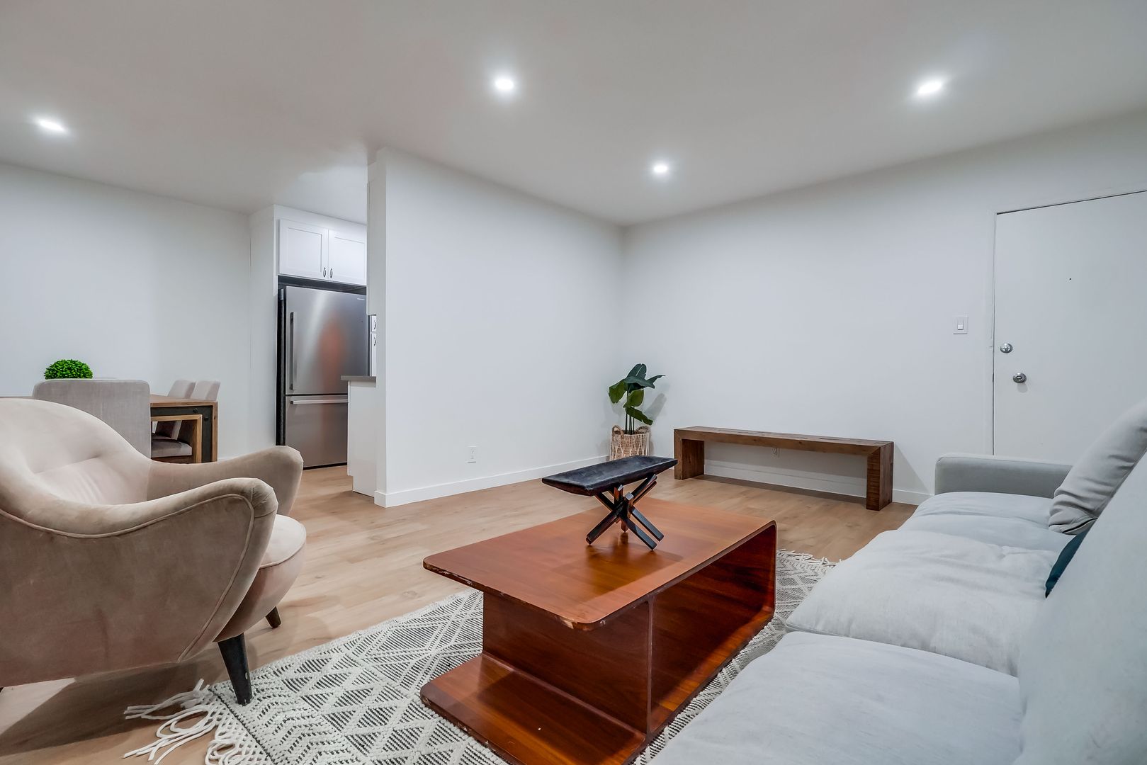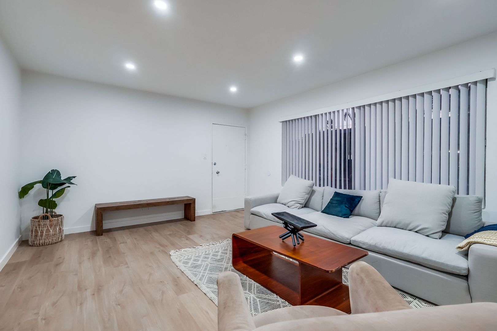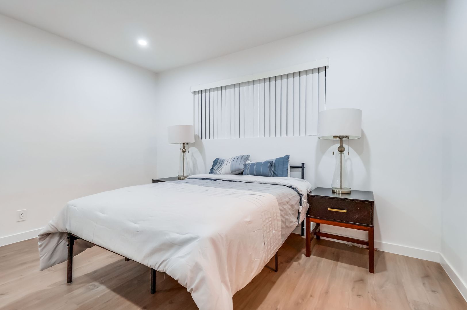 Spacious 2-bedroom, 2-bath first-floor unit in a secure, gated building with cameras. Features include central A/C, recessed lighting, in-unit washer/dryer hookup, and 1 assigned parking spot.